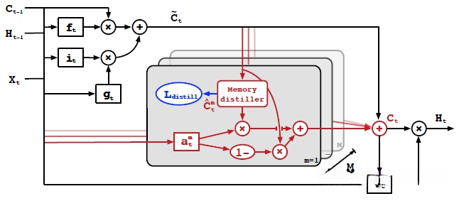 基于时刻 t 的通道注意力机制 atm ,对学生成员记忆 C_t 进行有选择性的遗忘操作,并利用 O_t 权重进行集成运算;图片来自参考文献 [7]。