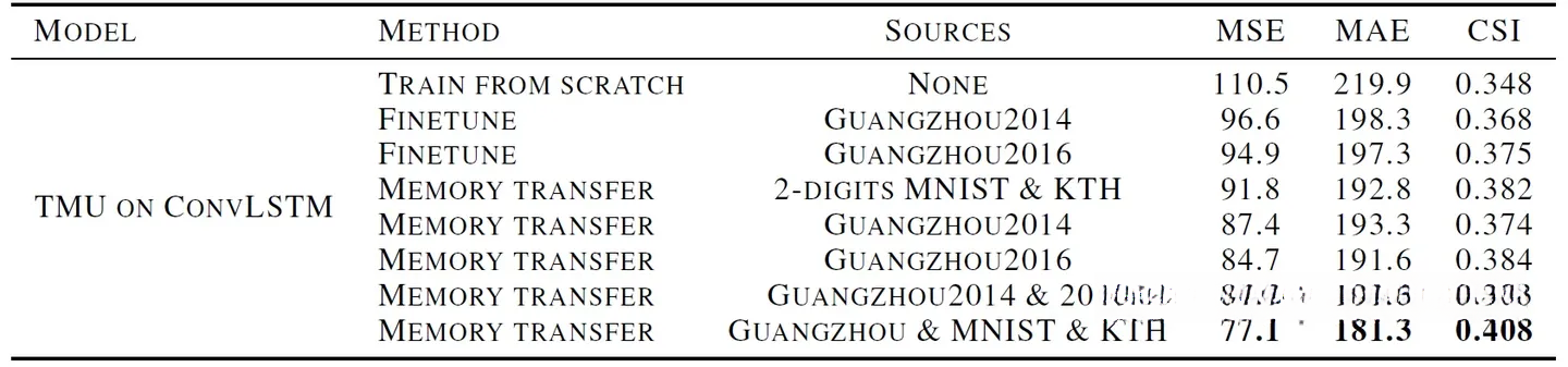 如表所示,在视频预测、人体运动及降水预测等多领域多任务上进行了跨数据域和跨任务域的实验研究。值得注意的是,在降水预测领域中采用2-DIGITS MNIST & KTH 作为教师模型进行参数蒸馏的表现优于使用GUANGZHOU2014/GUANGZHOU2016这一单一本地数据集。这表明TMU具备一定的跨任务迁移能力;同时通过引入新的数据源并未降低整体预测效果的能力,则验证了TMU在参数蒸馏迁移过程中获得了额外的学习潜力。