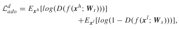 相较于基于传统 KD 的迁移算法直接优化教师与学生之间的特征关联,在CRKD中为了增强模型对不同分辨率信息的感知能力(relation-aware)并防止过拟合,则采用了对抗分类损失函数训练分类器来施加对高低分辨率输入对 (�ℎ,��) 的分类约束,并通过采用GAN训练方法实现教师模型传递知识给学生模型时保持特征在处理不同分辨率信息时的有效性