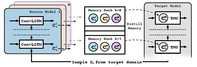 该方法通过从多个源域预训练生成的记忆库对目标域模型实施记忆蒸馏,
