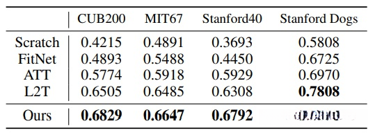 AFD分别在知识蒸馏的模型压缩与迁移学习两个研究方向上展开了深入探索。其中,在迁移学习领域中,默认采用图像分类基准数据集ImageNet作为源任务,并针对多个目标任务如CUB200鸟类分类、MIT67室内场景识别、Stanford40人体动作识别以及Stanford Dogs犬类识别等进行迁移应用。