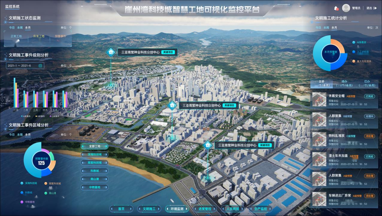 在《三亚崖州湾科技城智慧工地建设技术标准》的指导下,通过共享融合中台的基础视频平台、AI视频分析能力、物联感知设备与人工巡检相结合的方式,对工程项目进行全方位监管。通过基础视频平台将各工地视频监控进行无缝对接,统一接入视频平台进行统一管理;通过AI视频分析能力自动识别各项目工地现场各类异常隐患事件,一旦发现异常事件自动向施工方、管理局及巡检单位相关人员发送预警提醒,施工方需及时解决隐患并由巡检单位现场复核。针对逾期未处理异常事件或多次出现隐患事件的工地,管理局将下发整改通知,并进行相应处罚。打造超前预警、及时报警、现场处置、整改落实等闭环管理机制。目前,已对本年度107个在建项目的施工安全、施工质量、施工环境等方面进行全方位、全要素、全周期监管。