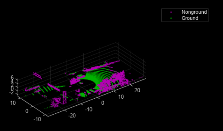 该示例采用混合方案进行处理,在该方案中 LidarData 和 pcfitplane 两个计算机视觉工具箱函数被调用。首先,在代码中调用 LidarData 函数以获取地面信息,并通过调用 pcfitplane 函数进行平面拟合操作。具体来说,在代码实现中首先通过调用 LidarData 函数获取车辆行进方向上的地面信息,并利用这些数据计算出地面参数的初始估计值。随后,在代码中调用 pcfitplane 函数对计算出的地面参数进行优化处理,并将优化结果用于后续的平面拟合操作中。这种混合方案通过分段稳健拟合地面并有效处理点云数据的变化特征。