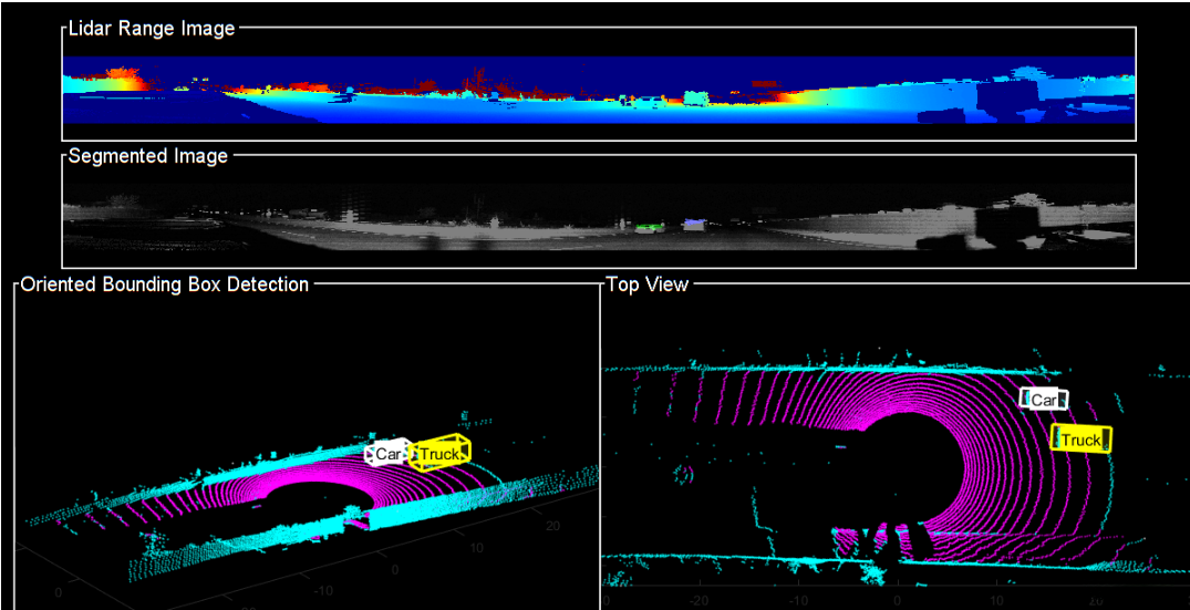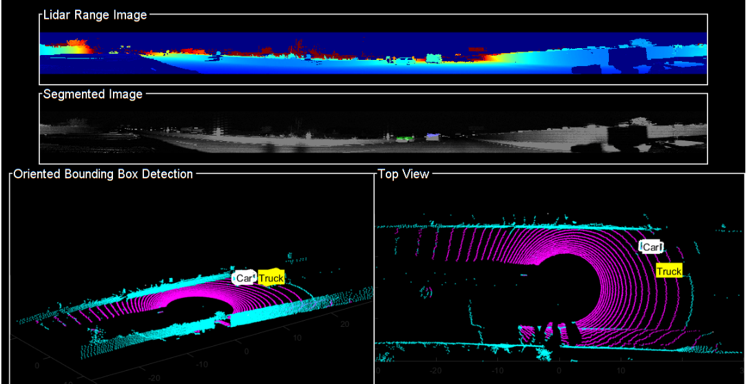此示例展示了在激光雷达数据集上实现对具有方向边界框车辆的检测与分类能力。此外,在多类信息目标对象追踪方面也进行了深入学习,并掌握了IMM筛选器的应用方法。通过补充更多的训练数据集以及优化现有模型参数配置等措施, 可以为提升语义分割性能提供有力支持
