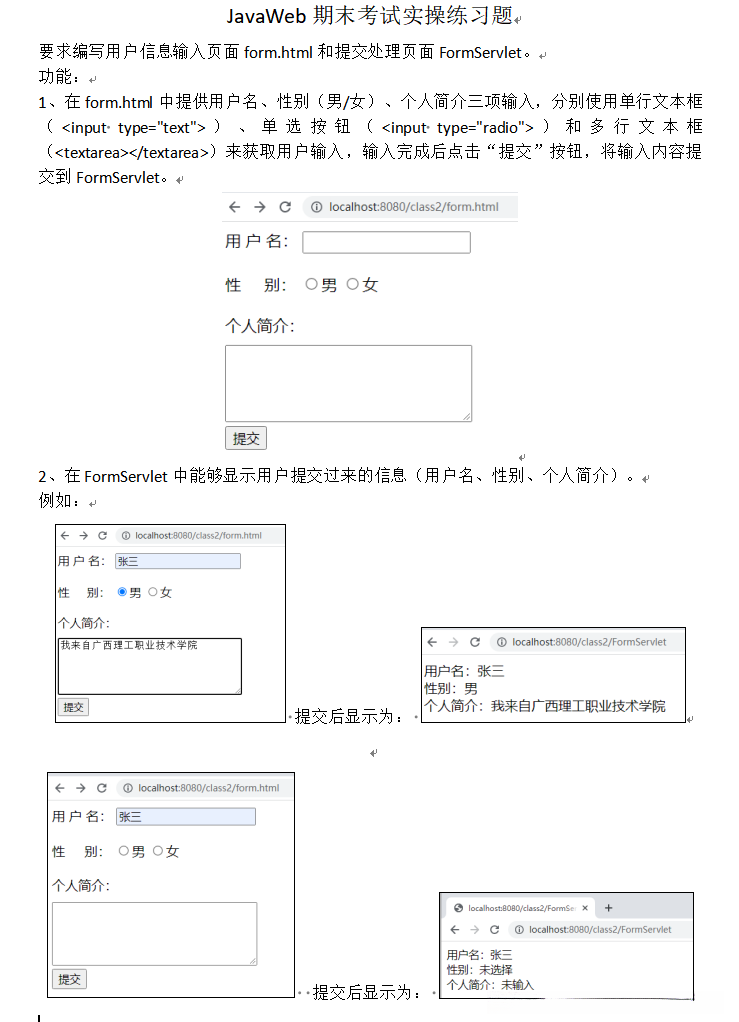 该文本描述了一个用户信息填写的网页(FormServlet.html)及其后端处理代码(FormServlet.java)。网页包含用户名、性别选择和个人简介三个字段,用户可以通过提交按钮将填写的信息发送到服务器。后端代码使用JavaServlet处理用户的提交请求,并将用户输入的信息以HTML格式输出到网页。代码中使用了HttpServletRequest和ResponseWriter接口,分别用于获取请求参数和写入响应内容。