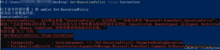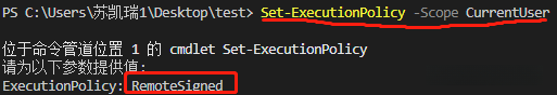 ②输入Set-ExecutionPolicy -Scope CurrentUser,然后输入RemoteSigned