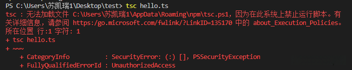 tsc命令尝试加载位于C:\Users\苏凯瑞1\AppData\Roaming\npm\tsc.ps1的文件失败,请注意此系统出于安全考虑禁止执行脚本操作。具体说明请参考https:/go.microsoft.com/fwlink/?LinkID=135170中的关于执行策略的部分。