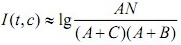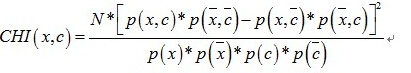 其中, A 为在类别 c 中特征词 t 出现的文档数; B 为在除了类别 c 的其他类别中特征词 t 出现的文档数; C 为在类别 c 中特征词 t 未出现的文档数; N 为所有类别中的文档数的总和。如果共有 m 个类别,那么每个特征词将得到 m 个相关度值,取这 m 个值的平均值作为每个特征词的权值,权值大的特征词被保留的可能性大。