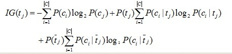 信息增益 (IG) 是公认较好的特征选择方法,它刻画了一个词语在文本中出现与否对文本情感分类的影响,即一个词语在文本中出现前后的信息嫡之差。某个词语的信息增益值越大,说明它对分类的贡献就越大。信息增益的计算见公式: