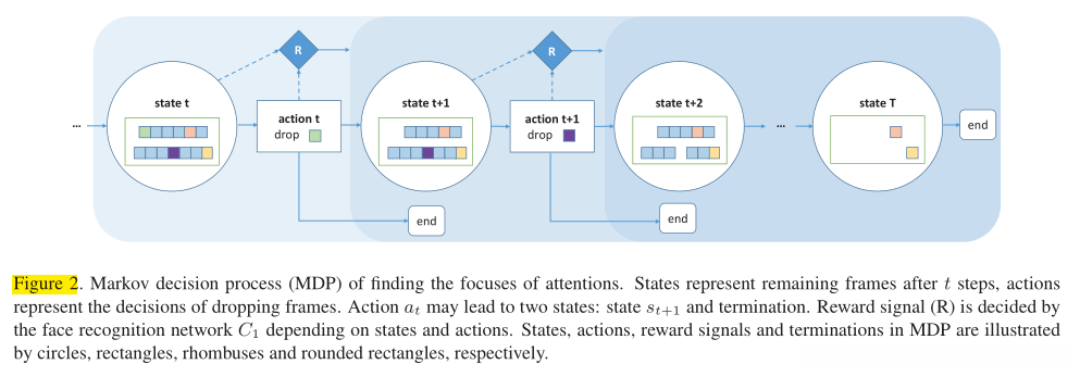 如图2所示,在注意力机制中所涉及的知识被体现出来。其中,在t时刻之后剩余的帧序列被定义为state t;而action t则指在t时刻被决定丢弃的一帧。图2的主要目标是找到注意力窗口。