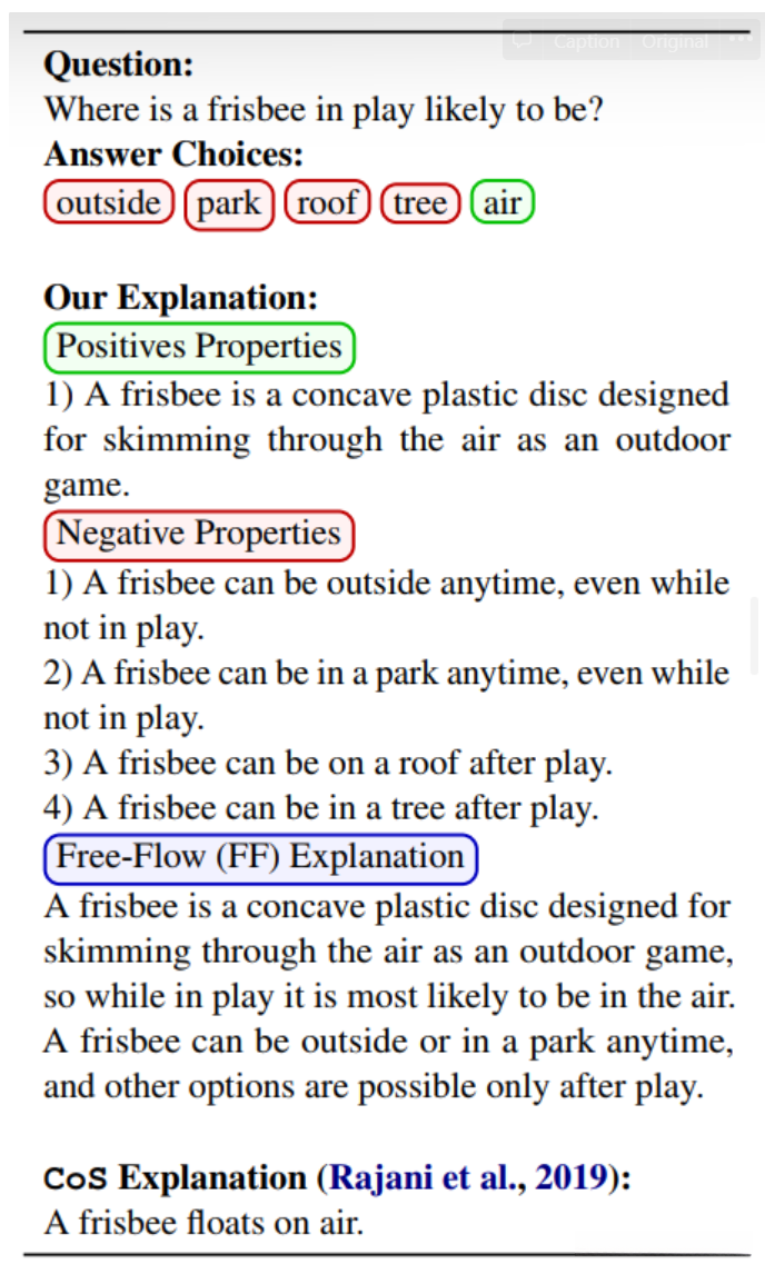 表 1:来自 CQA 数据集的示例以及我们的人工注释解释,包含支持正确答案选择的正面属性(绿色)、反驳错误选择的负面属性(红色)和自由流动的自然语言解释( 蓝色的)。 上面显示的 CoS 解释来自先前的工作(Rajani 等人,2019 年),其信息量不如我们的。