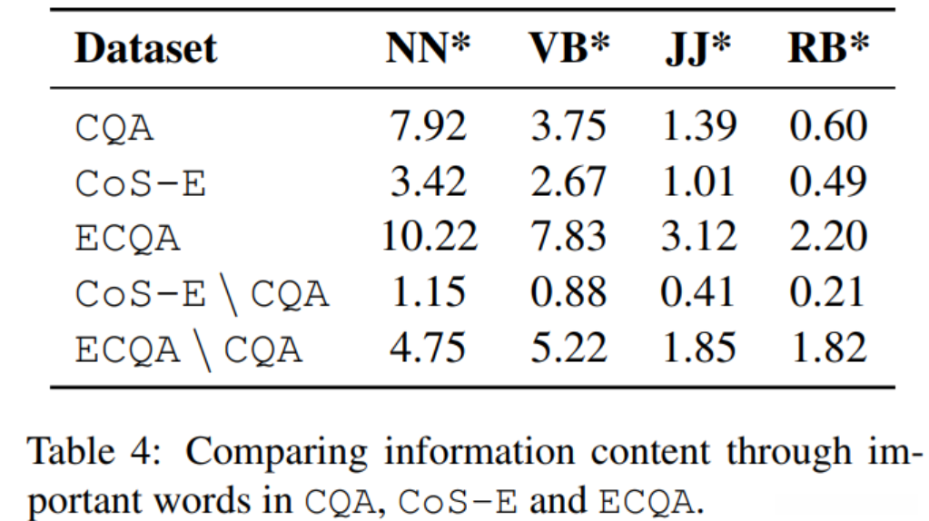为了衡量 ECQA 自由流注释提供了多少信息,我们计算了不同单词(基于词性标注的名词、动词、形容词和副词)的数量,并在表 4 中报告了它们的平均数量。前三行比较 CQA、CoS-E 和 ECQA 中的信息内容,而第四行和第五行告诉 CQA 的两个解释数据集的单个注释中存在哪些额外内容。 这给了我们一个粗略的想法,即注释引入了解释所需的新实体和关系。