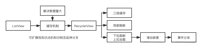 首先,什么是可扩展性知识点?是指一个知识点,作为一个根结点,它的延伸分支可以深入到很远。举个栗子。ListView,来大家跟我一起背,用于显示列表,需要一个adapter来对数组进行包装,通过RecycleBin进行缓存。……这就没了?不可以!请跟我继续:ListView如何对convertView复用?ListView中图片过多引起OOM如何解决?上下左右滑动冲突怎么做?ListView中可以包含大量图片,布局复杂导致卡顿怎么办?ListView如何实现下拉刷新上拉加载?用RecylerView代替ListView解决了什么问题?……