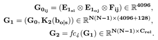 得到了物体特征E0之后,使用Relational embedding,最终变成了Nx8192的特征矩阵,其中前4096维指该物体做subject时候的特征,后4096则是object。然后对于每对object-pair,要判断其关系时,就需要4部分特征,subject特征,object特征,unionbox的RoIAlign特征,相对集合关系特征。结合这几种特征的方式如下