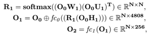 其中O是N*4808的物体特征矩阵,表示N个物体,特征维度为4808(类别概率分布,roialign和global context),W,U和H则是降维变换,于是R1可以看做一个物体之间的关联矩阵,矩阵第i行素代表第二个式子中更新第i个物体特征时N个物体特征每个占的权重。其实这个和图卷积差不多。另外从模型的示意图中可以看到,这个Module可以叠加,本文使用了两次叠加的效果比较好。