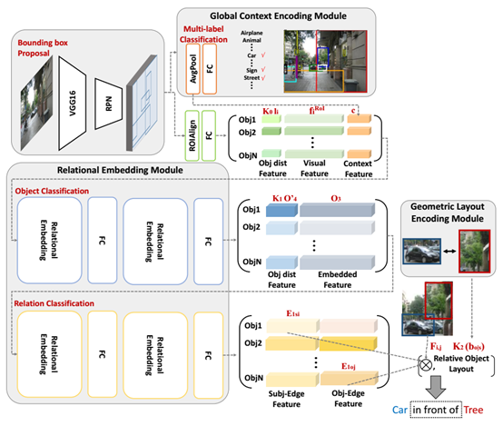 论文的主要创新点是对于scene graph generating任务设计了一个relational embedding module ,可以利用图片中所有的物体的特征对某个物体的特征进行更新,此外还提出了Global context encoding module 来encode全局的context信息,和geometric layout encoding module 来显式使用几何布局的信息。