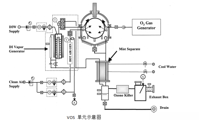 该作者创新性地研发出了一种替代方案,可替代过氧化硫混合物(SPM)清洗硅晶片,此工艺可替代过氧化硫混合物(SPM)清洗硅晶片,其名称即为蒸汽臭氧剥离法(VOS)。该过程采用臭氧与汽化水的结合应用,相较于传统方法,在减少环境、健康及安全影响方面具有显著优势,主要得益于同时采用了高浓度臭氧气体和高温水的技术手段,此外,在处理过程中还应用了具有高度反应性的OH*自由基物质,相较于其他利用臭氧的技术,在剥离光刻胶速率上更具优势,此工艺不仅能够去除离子注入型光刻胶层,并且也能高效处理蚀刻型光刻胶层;在电气可靠性测试领域中,VOS 工艺的表现与SPM相当并得到了广泛认可.