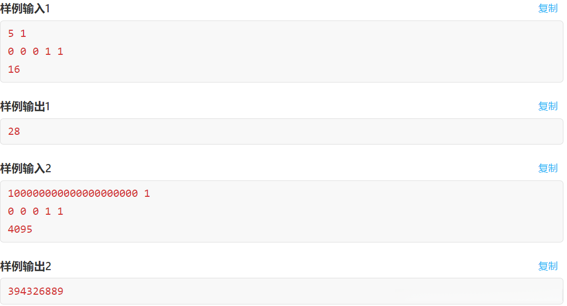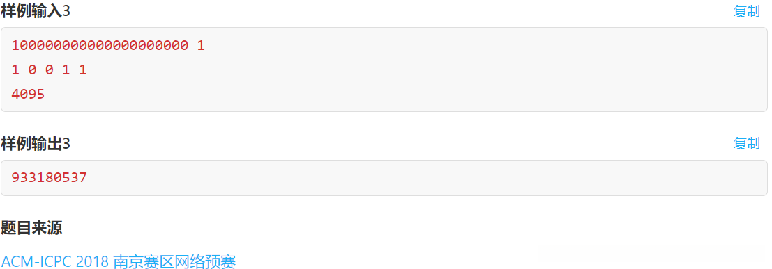 可以看出,最坏情况下,这里总共只会有K+1个数字。所以不用害怕可以选择的数字太多。注意到我要求的是异或和为0的方案数,异或和我们容易想到用线性基求解。对于这个N个数字,实际最多K+1种数字,我们建立线性基,不妨设这个基的基底数量为x。根据线性基的性质,所有的数字一定可以表示为这x个数字的线性组合。因此,除了这x个数字外,在其余数字种任意选取几个,它们的异或和也一定能够分解为这x个数字的线性组合,这是因为异或运算具有封闭性。然后在线性基下,可以选择的系数也只有0和1。也就意味着,N-x个数字种,选择任意一个子集,设它们的异或和为sum,那么我一定也能够在x个线性基的基底中找到一个子集,使得它们的异或和也为sum,这样两个集合的数字再异或起来,结果就是0,对应先手必败的方案。N-x个数字的自己个数是2^(N-x),所以这就是先手必败的方案。那么最后的答案就是: