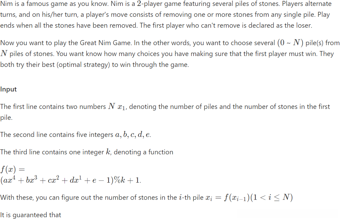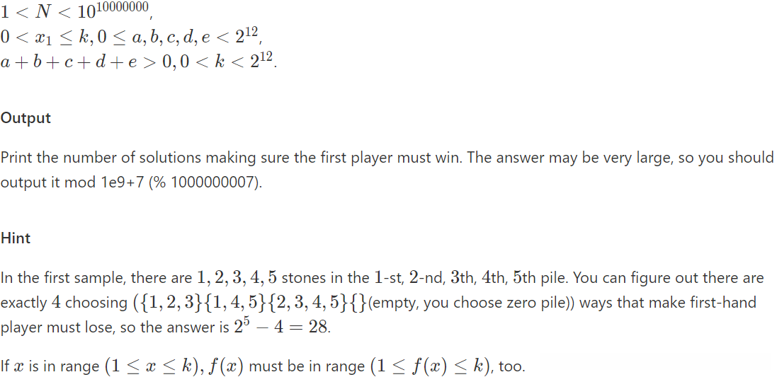 大致题意:Nim游戏,是指有n堆石子,每堆石子有ai个石子,两个人轮流取,每次可以取一堆的至少一个石子,最后取不的人输。现在告诉你总共有N堆石子,这个N很大,可以有10^10000000这么大,然后每一堆的石子数量有一个产生式。你的任务是在这N堆石子中,任意选取几堆石子,使得先手必胜,问方案数。