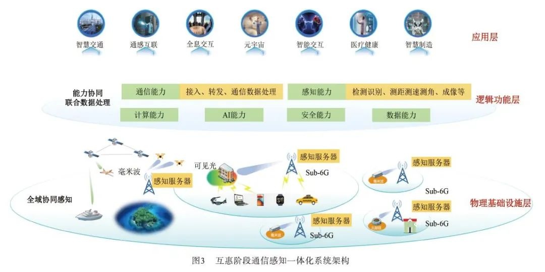 通信感知一体化系统架构包含三层结构:物理基础设施层、逻辑功能层及应用层。各层次间将通过整体协调管理实现统一编排与配置优化。在物理基础设施层方面,通信感知一体化以统一的网络架构为基础,在同一设备及频谱资源下实现通信功能与感知功能的深度融合。新型感知服务器承担着数据处理与联合信号处理的任务,并可在基站或网络端部部署运行。Sub-6G、毫米波段及其他多频段信号可灵活协同感知并响应业务需求,在分布式感知服务器间构建高效的数据交互机制以提升网络整体性能。逻辑功能层面则致力于为各类业务提供基础支撑能力,在多维度能力协同模式下更好地满足全新应用场景需求并为6G网络注入强大赋能能力。应用层面则通过引入位置服务与成像技术应用等创新服务拓展感知能力边界