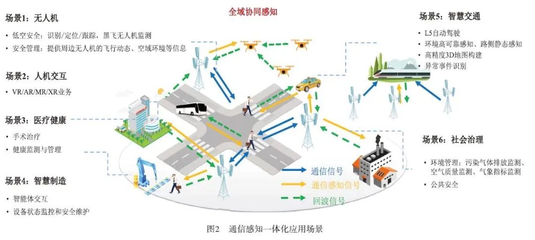 面向 sixth generation (6G) 的通信感知一体化被视为一种全域协同感知系统。该系统的构建具备广泛而精确的感知能力,并可对现有生活、生产以及社会发展进行深层赋能;从而推动数字经济呈现出显著的发展趋势;同时该领域在社会价值与商业价值方面均展现出巨大潜力。图 2 展示了典型应用场景。