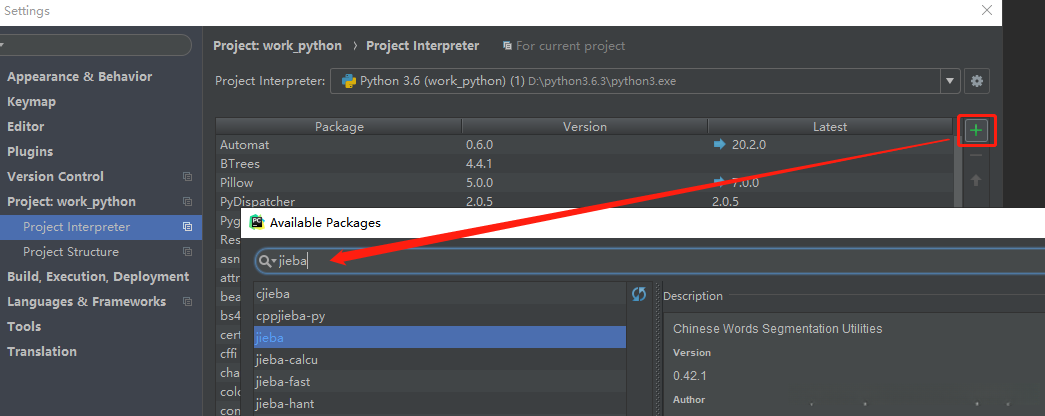 可以在PyCharm的文件夹→设置→项目(工作目录)→项目解析器中启用jieba工具包,并在下方用代码注释指定路径