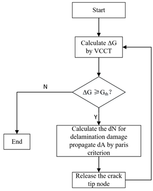 ABAQUS中采用损伤外推法对结构进行疲劳分析。首先通过VCCT对结构进行一次静力分析,计算得到其分层前沿节点的最大应变能释放率和最小应变能释放率之差DG,判断分层前沿节点是否发生扩展。然后通过Paris准则计算分层扩展dA所需加载循环次数(在有限元模拟中,dA通常为裂纹扩展方向上两个相邻节点的距离)。最后释放该节点,分层前沿位置发生了变化,此时重新计算分层前沿所有节点的DG,依次往复直至所有节点的DG小于Gth,分层不再扩展。