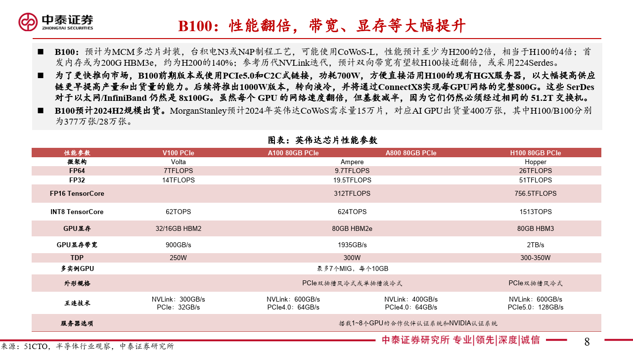 B100预计性能将大幅提升,GB200有望超预期表现。英伟达即将推出全新芯片架构BlackWell,这一设计首次采用多芯片集成设计,或将成为英伟达首款基于该架构的芯片。预计该架构将采用MCM多芯片封装技术,采用台积电N3或N4P制程工艺,并计划使用CoWoS-L封装技术,性能预计至少是H200的两倍、H100的四倍。此外,B100首发内存配置或为200G HBM3e,约是H200内存的140%。为了加快产品推出,B100的前期版本或采用PCIe5.0标准和C2C式连接技术,功耗控制在700瓦,同时兼容现有H100服务器架构。后续版本将推出1000瓦功耗版本,采用液冷散热技术,并通过ConnectX8互连技术实现每GPU网络的完整800G带宽。根据英伟达的芯片发布路线图,GB200预计将于2024-2025年发布,该架构将由CPU和GPU通过NVLinkC2C接口连接,或配备192GB HBM3e内存,性能有望显著超越预期。