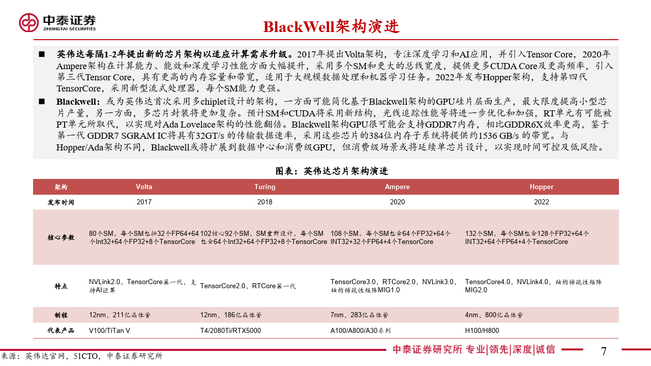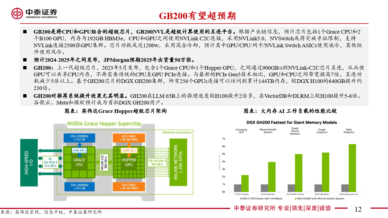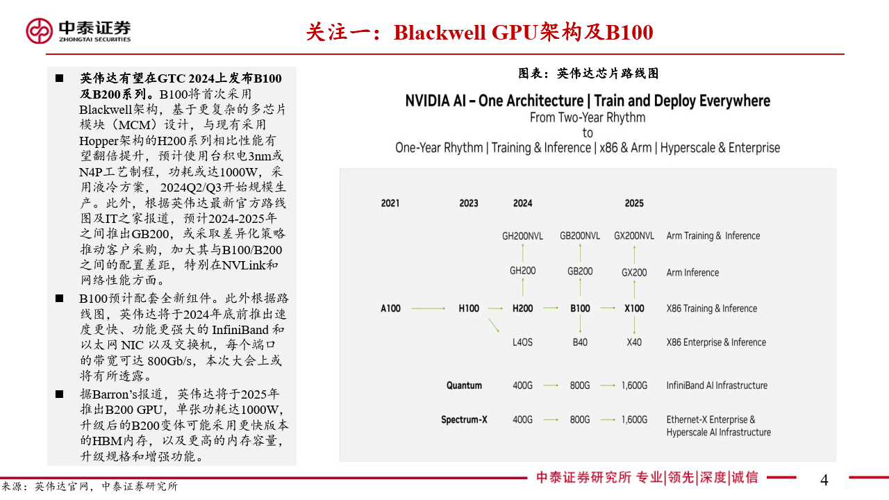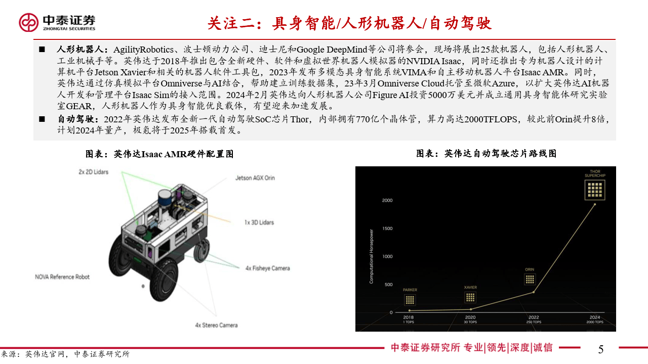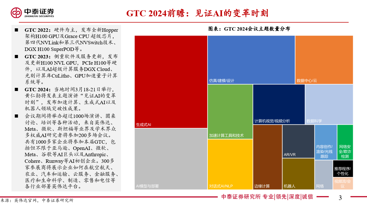 GTC2024即将召开,关注三大前沿领域:新一代GPU、具身智能及AI。GTC 2024将于当地时间3月18-21日在美国加州圣何塞的会议中心及线上举行,预计将发布加速计算、生成式AI及机器人领域的最新突破。建议关注以下三大方向:1)B100及后续芯片路线。采用BlackWell架构的B100预计性能将较H200系列提升一倍,预计于2024-2025年推出,芯片迭代周期缩短至1年,带动配套工艺及组件加速升级。2)具身智能:包括AgilityRobotics、波士顿动力、迪士尼及Google DeepMind等公司将在机器人相关会议参展,现场将展出25款机器人。黄仁勋曾表示,具身智能将是AI next wave,2024年初英伟达投资人成立FigureAI通用具身智能研究实验室GEAR,大会或将进一步更新相关成果。3)AI应用。本次GTC共有亚马逊、Anthropic、Runway等超过1000家参会企业,300多家参展商将展示英伟达平台在农业、汽车、云服务等行业的应用。多模态大模型助力AI赋能下游行业,提升推理侧算力与带宽要求,数据中心、CDN等或将在AI应用的推动下迎来新一轮流量增长。