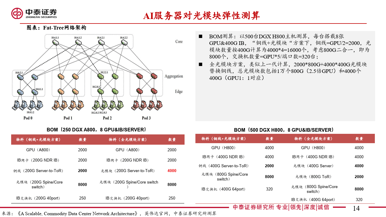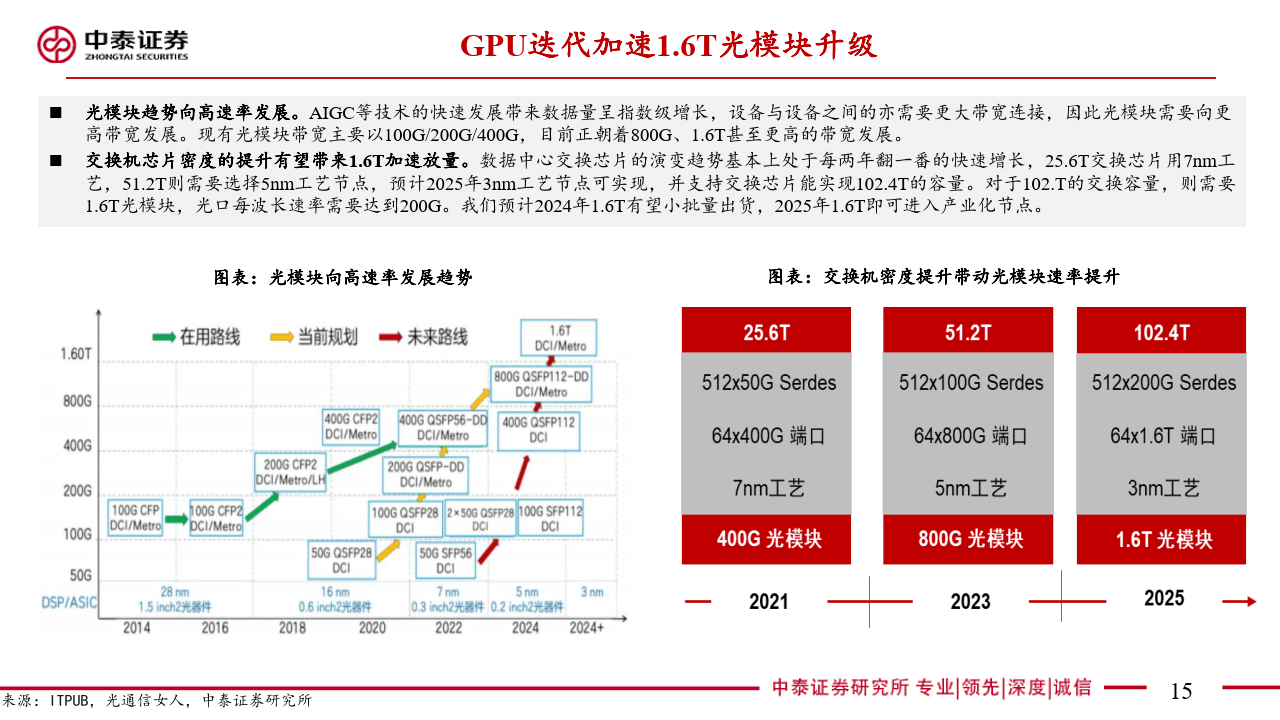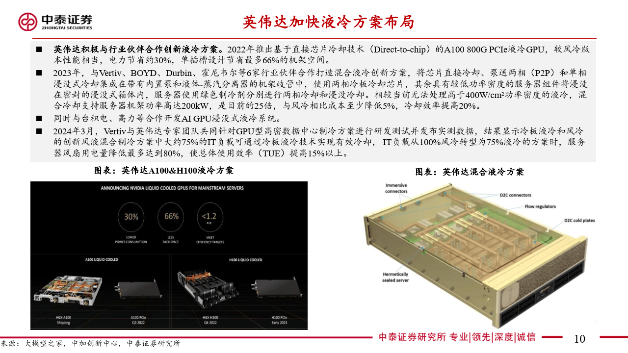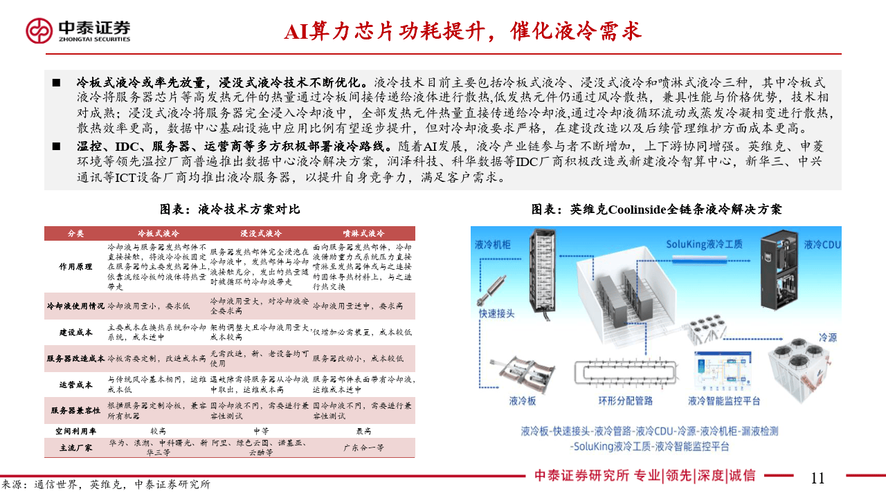 聚焦光通信与液冷产业链的最新动态,深入探讨新兴技术的变革方向。AI芯片加速升级将推动光模块、交换机等底层网络硬件的迭代升级,预计2024年1.6T需求将全面实现,伴随速率升级的同时,功耗成本增加等问题也将逐步显现。硅光、LPO、CPO、薄膜铌酸锂等新技术的引入有望加速推进。当前,国内光模块厂商已占据全球市场份额的半数以上,市场竞争加剧,推动光通信产业链逐步向国内转移。同时,光芯片的国产替代进程预计将进一步加快。B100后续版本的功耗预计将达到1000瓦,而GB200也将进一步增长至1200瓦。此外,英伟达已联合行业伙伴共同布局混合液冷等创新散热方案。算力器件的功耗持续攀升,这对传统风冷散热技术带来了严峻挑战,AI算力的普及将进一步加剧数据中心的能耗提升和PUE指标趋严,这将倒逼产业加速向液冷技术升级。其中,冷板式液冷技术或将成为 immediate 的放量方向,而浸没式液冷技术则被视为长期发展的重点方向。在这一背景下,温控、IDC、服务器、运营商等多方均积极布局液冷技术路线。随着AI技术的快速发展,液冷产业链的竞争参与者也将不断增加,产业链上下游之间的协同效应也将进一步增强。
