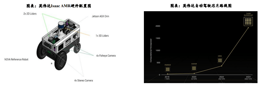 机器人领域:AgilityRobotics、波士顿动力、迪士尼和Google DeepMind等企业将参与展览,现场将展示25款机器人产品,涵盖人形机器人、工业机械臂等。英伟达于2018年推出了NVIDIA Isaac平台系列,该平台包含全新硬件、软件和虚拟世界机器人模拟器,同时推出了专为机器人设计的计算机平台Jetson Xavier和相关机器人软件工具包。2023年,英伟达发布了多模态具身智能系统VIMA和自主移动机器人平台Isaac AMR。此外,英伟达利用仿真模拟平台Omniverse与AI深度融合,以辅助生成训练数据集。2023年3月,英伟达将Omniverse Cloud迁移至微软Azure云平台,以扩大Isaac Sim平台的接入范围。2024年2月,英伟达向美国的人形机器人公司Figure AI投资5000万美元,并成立了通用具身智能体研究实验室GEAR,该实验室将推动人形机器人领域的快速发展。