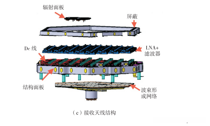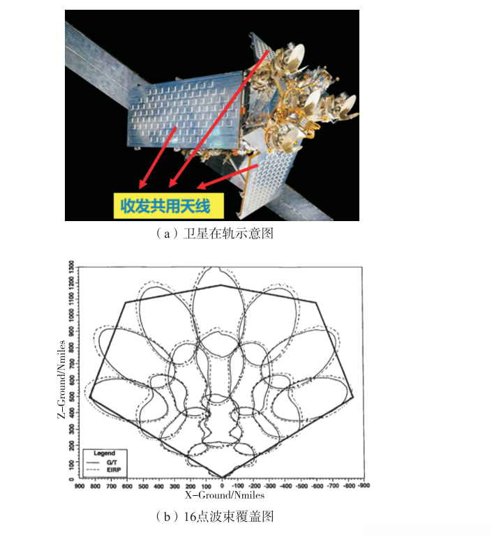 如图 2(c)和图 2(d)所示,每副相控阵天线阵列由 106 个轻量贴片辐射器组成,每个辐射器由一个 T/R 模块驱动,这些模块又由优化的波束形成网络共同激发。贴片阵列安装在铝质蜂窝平板上,功率调节器和 T/R 模块也粘合在该平板结构上,以获得良好的热和机械连接。模拟波束形成网终由 8个16x16 Butler 矩阵组成,这些矩阵依次由 10 个 8x8正交 Butler 矩阵馈送,可用于形成 16 个优化的接收/发射赋形波束,其中 T/R 模块用于在接收状态 中保持高 G/T 并在发射状态下生成高效的 EIRP因此每颗卫星总共可以产生 48 个波束。