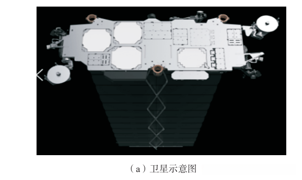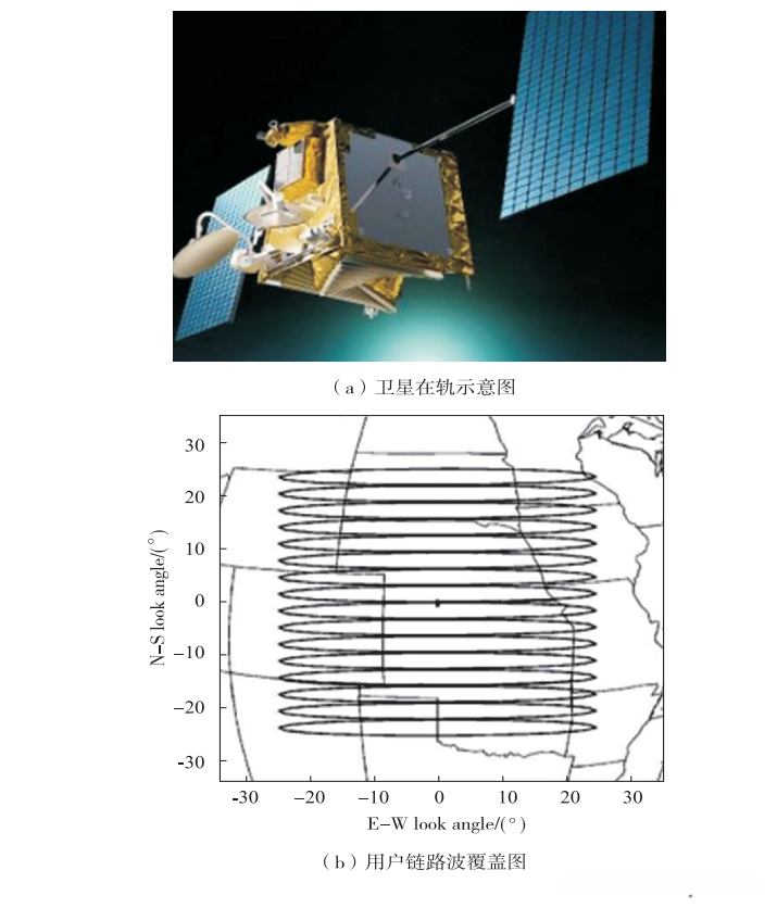 1987 年,美国摩托罗拉公司提出并部署了第一代真正依靠低轨卫星星座提供联系的全球个人通信系统,并将之命名为“钺星(Iridium)”[1-2]。星星座由分布在 6 个极轨道平面上的 66 颗卫星组成轨道高度为 780 公里,轨道倾角为 86.4。如图 2(a)所示,每颗卫星的主任务天线由 3 个收发共用的 L 频段有源多波束相控阵天线组成,它们以一定角度面向地球,提供从卫星到地面用户的 L 频段链路。每副相控阵天线采用固定波束覆盖方法,其 16点波束覆盖图如图 2(b)所示。