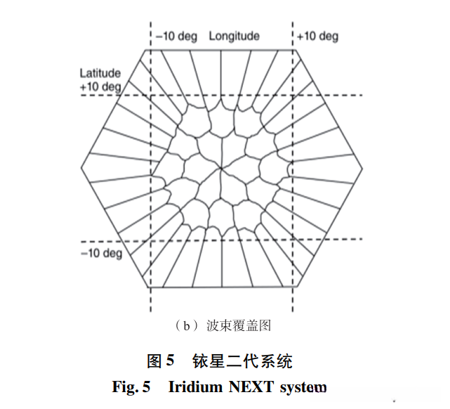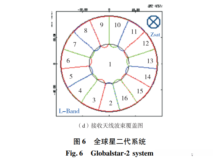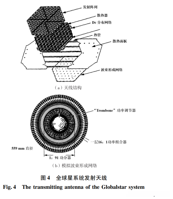 新依星公司于 2007 年提出的星二代( IridiumNEXT)计划是第二代星系统,可以提供高质量的语音和数据通信[0。它由 66 颗 LEO 卫星和另外 9颗在轨备用卫星以及 6 颗地面备份卫星组成。星二代的轨道参数与星的轨道参数是一致的。如图 5 所示,卫星的主任务天线是一个 L 频段由 120 个单元组成的平板相控阵天线,可产生 48 个发射和接收波束,用于与用户终端通信。同时,每颗卫星还使用两个 Ka 波段馈线链路天线生成两个20/30 GHz 的可移动波束以与地面网关相连接。此外,该系统还支持星间链路功能,可通过两个固定天线和两个可动天线实现同一轨道前后及相邻轨道亚面左右共 4 颗卫星之间的通信连接。2010 年开始建设的全球星二代( Globalstar-2)[]是第二代全球星系统,它继承了全球星的关键技术,采用了相似的平台,并仍然采用收发分开的固定多波束相控阵天线体制。如图 6 所示,为了增加在轨寿命(从 Globalstar-1 的 7.5 年增加到 Globalstar-2 的 15 年)和降低成本,S 频段发射天线采用了半有源相控阵天线,即发射天线采用两个无源多面圆顶天线(TX10、TX6)组成 16 个波束和一个多端口放大器提供信号放大。中心波束 1 由 TX10 的喇叭生成。此外,TX10 的其余9 个辐射面形成9 个波束,TX6 的6 个辐射面( 每个辐射面有 8 个单元)在中间形成 6 个波束。此外,多端口功率放大器可以实现波束之间的功率调节。接收天线仍采用 L波段有源 16 波束相控阵天线。接收天线由 52 个单元间距为 0.6 波长的辐射单元、滤波器和低噪声放大器以及波束形成网络组成。具有 7 个多层板的模拟波束成形网络能够使用 3 dB 混合分配器来提供低色散波束成形性能。