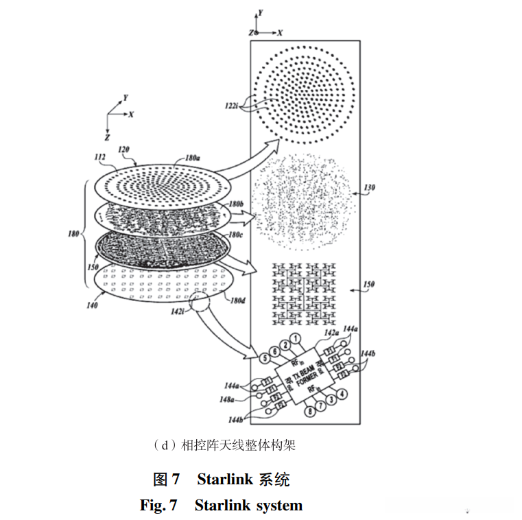 2015 年,美国 SpaceX 公司提出了大规模巨型星座计划 Starlink,其目标是为全球提供高速、低时延宽带接人服务[12-13]。Starlink 星座由分布在550km 处的 4409 颗卫星和分布在 340 km 高度处的 7518 颗卫星组成。截至 2022 年 9 月 15 日SpaceX 已经发射了 3293 颗卫星,其中包含两颗试验卫星,最近一次发射发生在 2022 年9 月11 日,将34 颗卫星发射到低地球轨道上。Starlink 卫星部署的 Ku 频段多波束相控阵天线代表了民商用通信卫星相控阵天线的最新水平,它采用了跳波束覆盖技术,并于 2019 年实现了在轨应用。如图 7 所示,相控阵天线采用由内向外逐渐稀布的方式。它采用瓦片式构架,总体来说分为 4层,包括天线阵面层,映射层,多工馈电层和波束形成层。波束形成部分使用仅包含移相器的 8 通道 8波束多功能芯片,这可以降低芯片成本、尺寸和功耗。在该方案中,多个天线波束和相位扫描功能由多功能芯片实现.振幅加权由阵列排列实现。