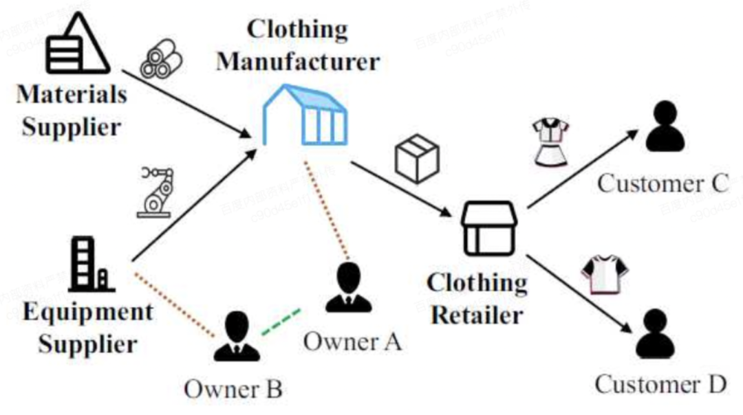 (如图:服装工厂的供应链 | 供应链网络是随时间变化的,所以可以表示成 T 个时刻的快照集合)