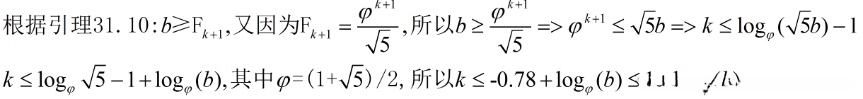 根据31.2-5的结论可知,在算法运行过程中,EUCILD函数总共经历了(1 + lg b)次递归调用,其中在计算a除以b时使用的取模操作涉及(lg a + 1)次位运算。这些因素共同决定了总的位运算是这两个因子相乘的结果,并进一步简化为μ(a, b).当处理两个具有相同长度的数字时,即当输入两个具有β位长度的数字a和b时,此时lg a和lg b都等于β,因此相应的总运算是(O( (1 + β)^2 )).忽略掉低阶项后即可得出结果。