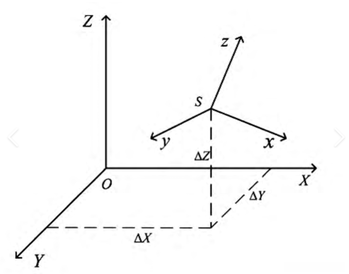 在将物体从一个参考坐标系转换到另一个参考坐标系的过程中, 我们需要执行仿射变换以实现两坐标系统间的转换目标. 通过旋转矩阵来体现各坐标轴之间的相对旋转状态, 而平移矩阵则用于表示两个不同参考系统之间的位置差异.