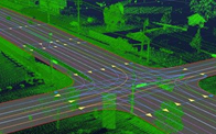 图5 高精地图实例。该图表中的绿色标记代表道路及其周围的点云模型;由箭头指示的道路线条和曲线则表示了车道矢量信息。
