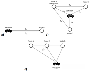 图3 车联网定位方式。a)TOA方式 b)TDA方式 c) AOA方式[1]