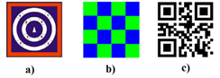 图9 人工路标定位示例。 a)同心圆路标 b)彩色方格路标 c)二维码路标[33]。