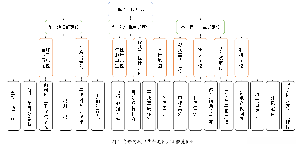 从采用的方法层面出发,在自动驾驶系统中,单个定位方式可分为三类:具体而言是基于通信机制、基于航位推算以及基于特征匹配的技术[5]。本节将对这些定位方式进行详细阐述,并着重探讨它们的工作原理及其优缺点,在最后进行了定性和定量比较。自动驾驶中单个定位方式的概览图如下所示。