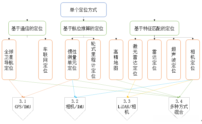 本文旨在从定位方法的层面出发对各类定位手段进行分类比较与深入研究。主要从单个定位方式和融合定位方式两个维度展开讨论,并将这三大类定位方法分别对应于以下三种类型:通信基因除外的数据处理方法、基于航位推算的方法以及基于特征匹配的技术。在第二部分中详细阐述每种方法的工作原理及其优缺点;第三部分则聚焦于当前应用较为广泛的融合定位技术;第四部分则深入探讨了该领域的发展动态及未来趋势。