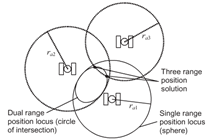 GNSS主要由空间卫星群、地面控制站和用户端三部分构成。它基于飞行时间原理(Time of Flight, TOF)实现定位功能。使用一个卫星时可以在一个球面上确定物体的位置;使用两个卫星时可以在两个球面的交集——圆上进行定位;当使用三个卫星时,则能将物体定位到上述圆与球面的交点上(如图2所示)。在实际应用中很容易识别出其中一个交点处于太空位置,因此理论上只需利用三颗卫星即可确定物体的空间位置[4]。由于接收机与卫星之间的距离未知因素存在,则需要至少四颗卫星才能完成精确的定位过程