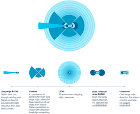 优点如下:1)具备很强的穿透力,在一定程度上能够有效抵御水、沙尘等环境;2)具有较低的成本;3)完全不受电磁因素的影响。这种方式也有一些不足之处:1)由于其有限的检测范围,在一定程度上限制了其应用效果;因此通常会在车辆低速行驶时布置多台设备以提高检测效率;2)该方法难以准确判断障碍物的具体位置;例如当有两个障碍物返回相同的探测距离时会引发误判;3)容易受到车速、震动、温度及湿度等外界因素的干扰。
