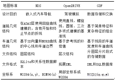 关于HD Map的数据格式规范及其应用现状。对于HD Map的数据格式规范及其实现情况而言,在当前技术领域内已形成两种较为成熟的技术方案:即导航数据规范(Navigation Data Norms, NDN)和开放驾驶规范(OpenDRIVE)。这两种方案在很大程度上借鉴了传统地理数据文件规范(Geographic Data Files, GDF)的理论基础,并形成了各自独特的特点。它们与传统的地理数据文件规范对比见表1。无论采用哪种分类方法,在基于特征匹配定位方面均发挥着重要作用。