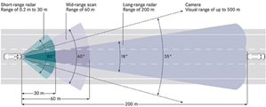 中距离雷达主要采用76至77 GHz频段进行信号接收与处理其覆盖范围约在60米内可实现扫描扇宽约达60度的有效探测。相比之下长距离雷达则采用更高的频率即77 GHz能够将探测范围扩展至约200米远但其扫描扇宽仅约达20度由于技术限制导致成像精度相对较低。就技术性能而言中远程雷达相较于短距离设备具备较高的检测精度以及紧凑的小型化设计特点然而其制造工艺要求更为严格且技术成熟度有待进一步提升因此通常应用于车辆动力控制与安全辅助系统等领域图示则直观展示了三种车载毫米波雷达的工作覆盖范围