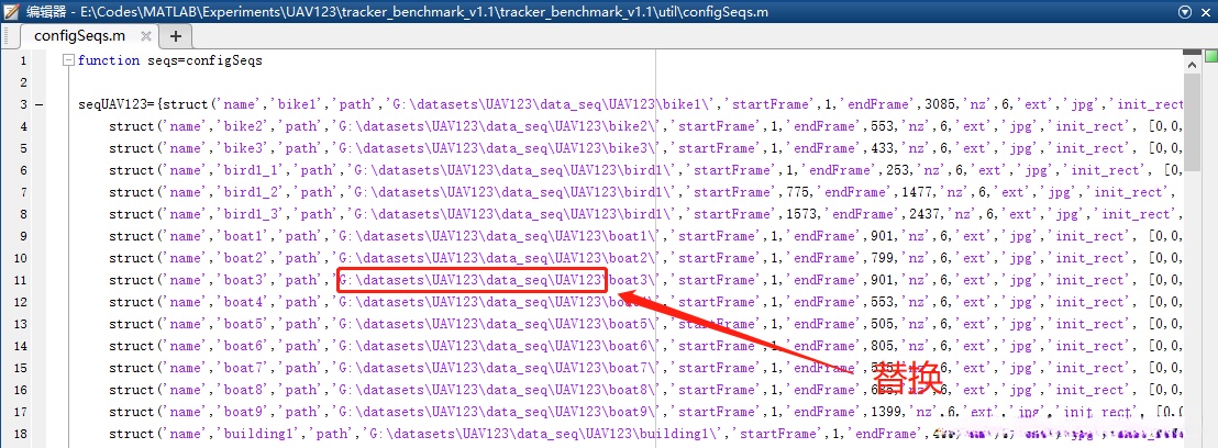 2、更改tracker_benchmark_v1.1\util\configSeqs.m为UAV123数据集所在路径