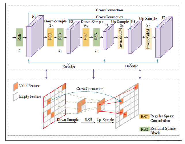 引入编码解码稀疏模块:该模块显著提升了三维特征提取器对于空间非连通区域的信息交互能力,并能可靠地提取出符合各类目标检测需求的关键特征。