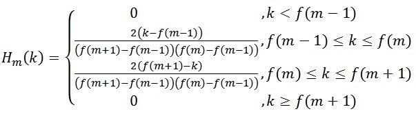 将能量谱通过一组Mel尺度的三角形滤波器组,定义一个有M个滤波器的滤波器组(滤波器的个数和临界带的个数相近),采用的滤波器为三角滤波器,中心频率为f(m),m=1,2,...,M。M通常取22-26。各f(m)之间的间隔随着m值的减小而缩小,随着m值的增大而增宽,如图所示: